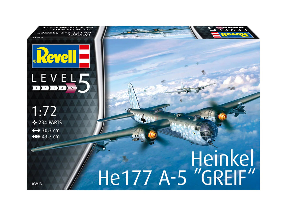 Der Heinkel He177 A-5 Greif Modellbausatz im Maßstab 1:72 ist ein beeindruckendes Nachbild des einzigen viermotorigen Bombers der Luftwaffe, der ab März 1942 geliefert wurde. Dieser Bausatz ist perfekt für Modellbaufans ab 13 Jahren geeignet und fällt in die Kategorie Level 3, was bedeutet, dass er einfaches Kleben und Bemalen voraussetzt. Mit insgesamt 234 Teilen kannst du ein detailliertes Modell mit einer Länge von 303 mm, einer Höhe von 80 mm und einer Spannweite von 432 mm erstellen.