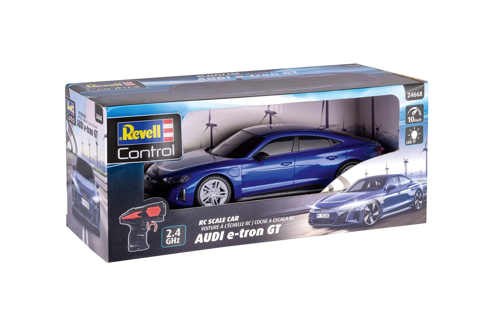 Revell Control präsentiert stolz das RC Scale Car Audi e-tron GT - eine Miniaturversion des außergewöhnlichen Elektro-Sportwagens im Maßstab 1:24. Dieses ferngesteuerte Auto verkörpert den Fortschritt auf zeitgemäße Art und Weise und fängt die Sportlichkeit, Hochwertigkeit und den Komfort des Originals ein. Der Audi e-tron GT von Revell Control ist das ultimative Erlebnis für alle Audi-Fans und ein Muss für Liebhaber von Präzision und Detailtreue.