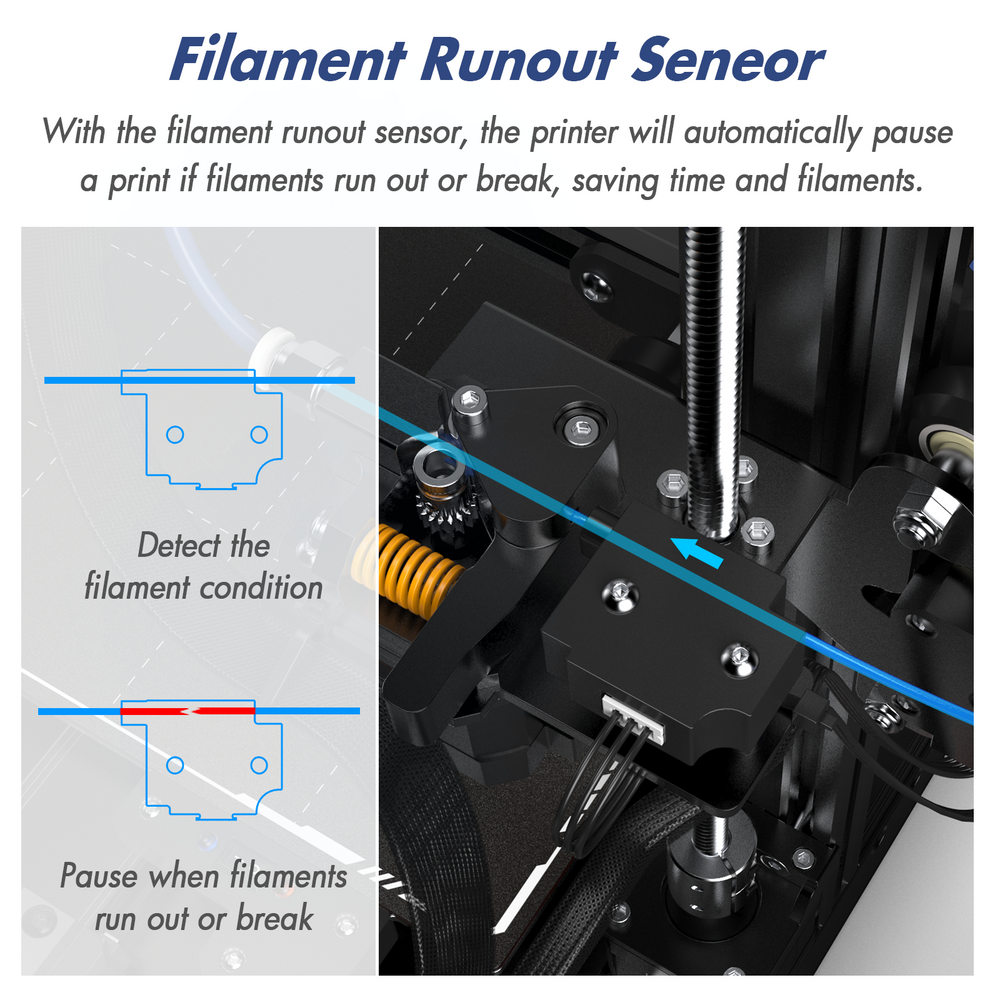 The filament runout sensor allows printer to automatically pause a print if filament runs out or break, therefore saving time and filament.