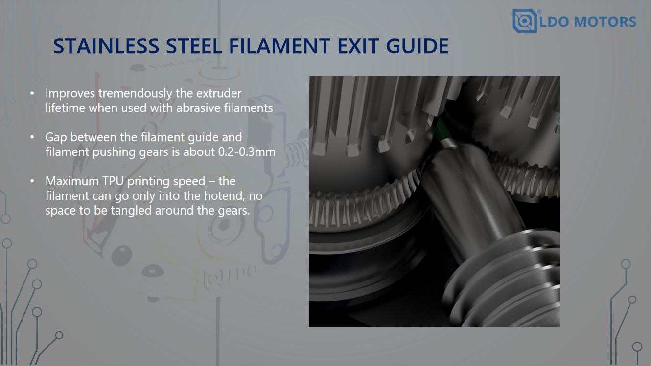 Stainless steel filament exit guide with 0.2-0.3mm clearance to drive gears: This ensures a smooth filament path for better printing results and extreme wear resistance.