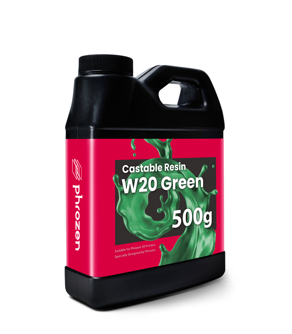 Phrozen Castable Resin W20 Green is developed for reliable casting with clean burnout and zero ash content. It is designed for both jewelry and dental casting, specifically fine and delicate features such as milgrain, micro claw, and wired patterns plus engraved and raised text.