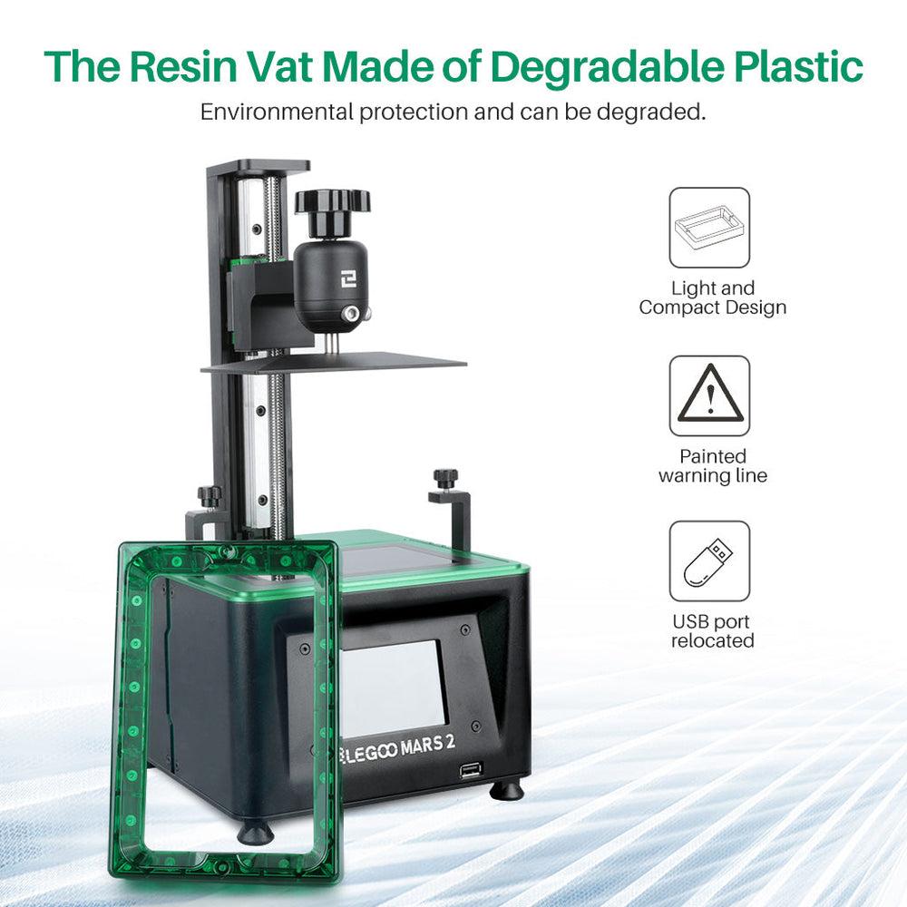 Sturdy build quality: CNC machined aluminum body makes Mars 2 a very formidable machine. A newly-designed sandblasted build plate has a much stronger adherence during printing and enables consistent printing success. Built-in active carbon could absorb the fume of resin and offer you a refreshing printing experience.