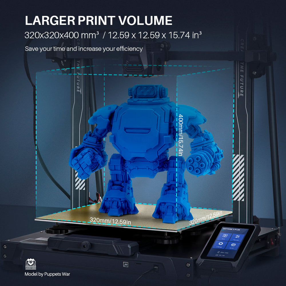 【Larger Print Volume】The larger-than-average build volume of 320x320x400mm/12.59 x 12.59 x 15.74 inches gives you enough space to freely arrange your prints, print larger models, or carry out batch printing with high efficiency.