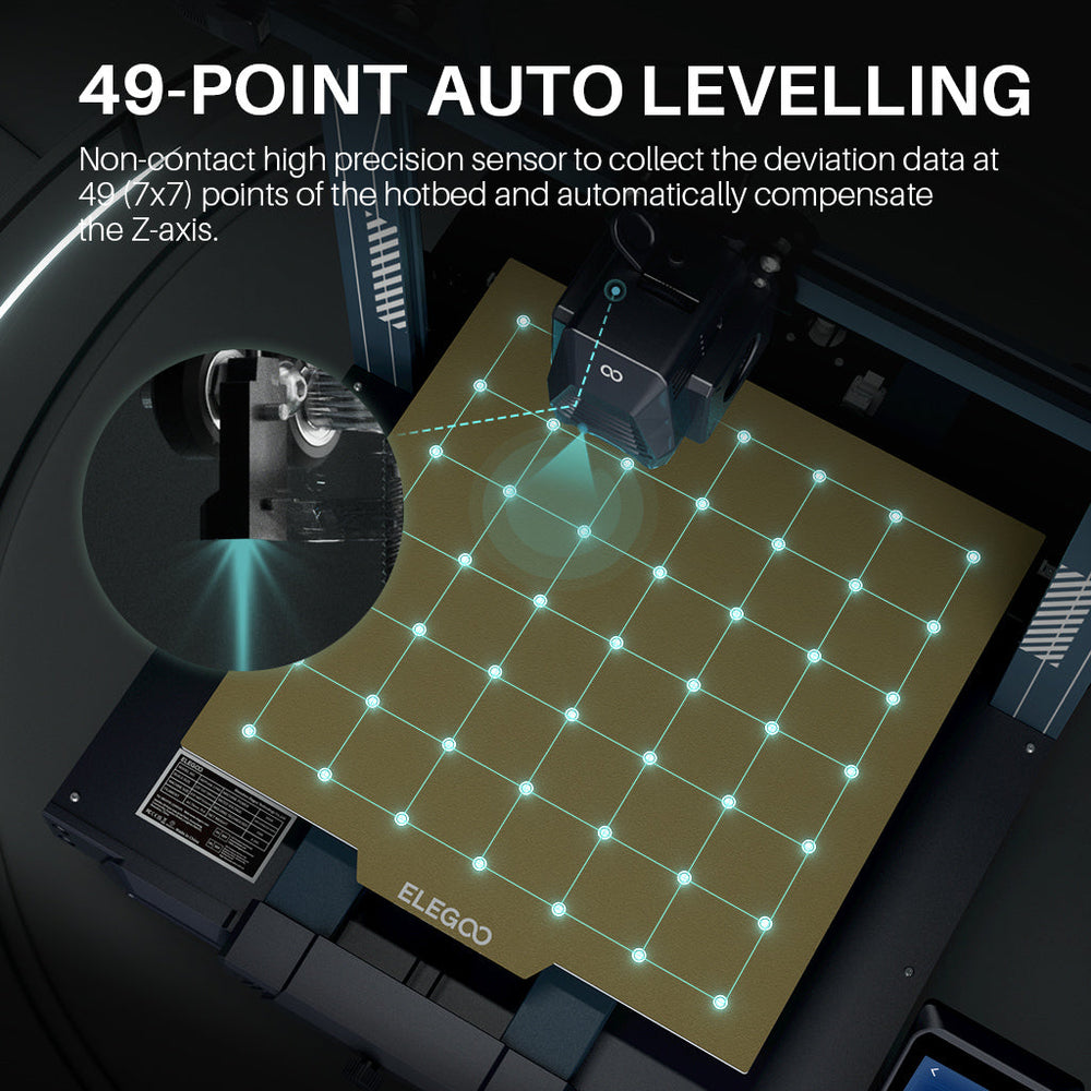 【Auto Bed Leveling】ELEGOO Neptune 3 Plus adopts a non-contact high precision sensor to collect the deviation data at 49 (7x7) points of the hotbed, and then automatically adjust the Z-axis height to compensate for any irregularities and unevenness of the printing bed. There are also hand-twisting knobs underneath the hotbed to fine-turn the print bed with a single twist, thus ensuring a perfect first-layer print.
