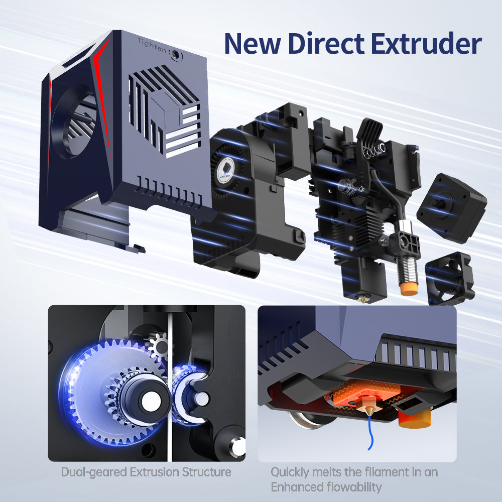 Upgraded extruder power reaches up to 60 watts, quickly melts the filament in an enhanced flowability;Dual-geared extrusion structure accurately controls material delivery.