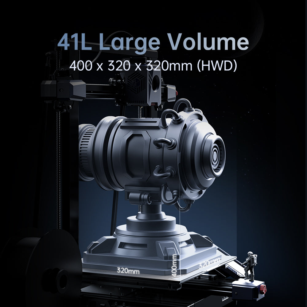 320*320*400mm large printing size, can print models of approximately 41 liters in volume at one time. Full-sized printing of the same model, compared to similar products on the market with a printing speed of 50mm/s, printing time is shortened by 31 h 35 mins, efficient creation, energy-saving, and environmental-friendly.