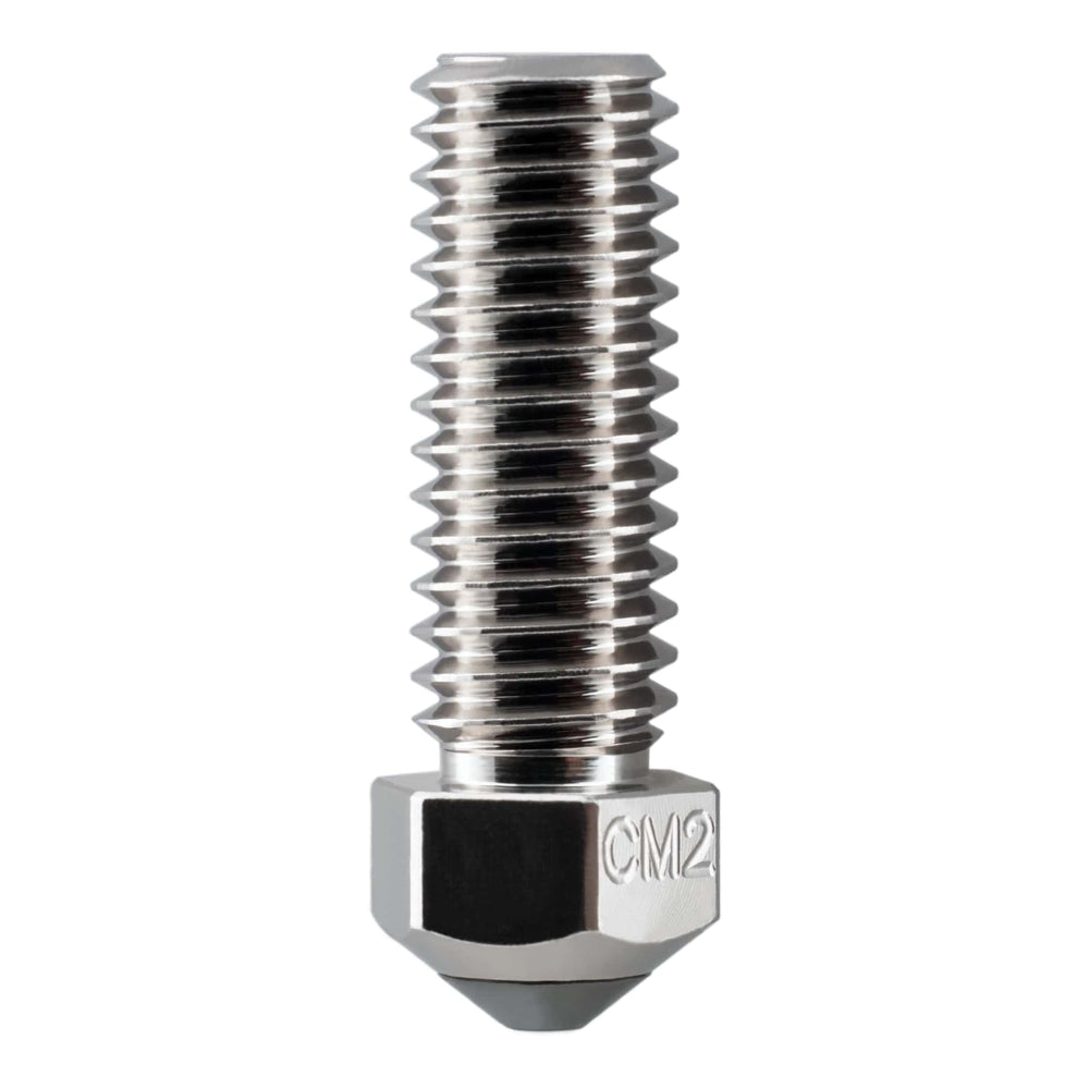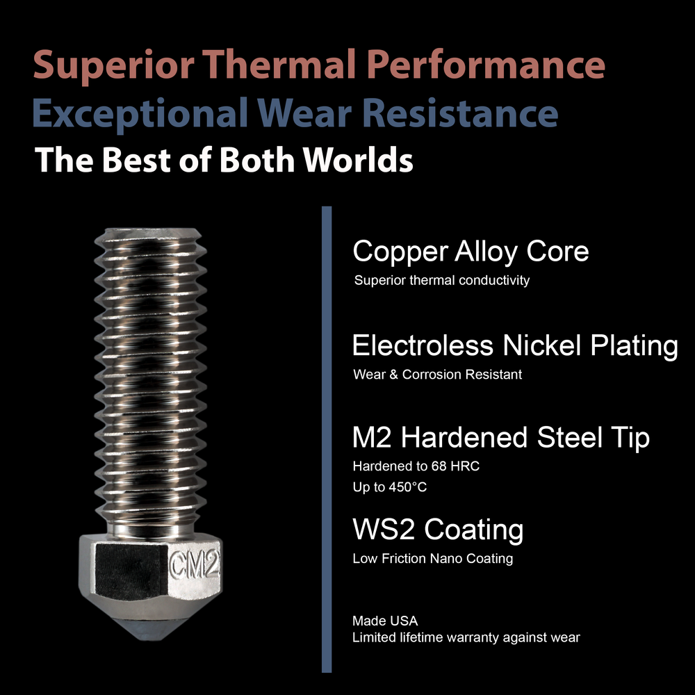 Micro Swiss CM2™ Nozzle is an ideal nozzle for all applications. Core of the nozzle is made of high-temperature Copper Chromium Zirconium and plated with an Electroless Nickel Plating. This special alloy retains its strength at much higher temperatures compared to a regular copper alloy. The tip of the nozzle is made of M2 Hardened High Speed Steel and coated with a special nonstick nano coating.