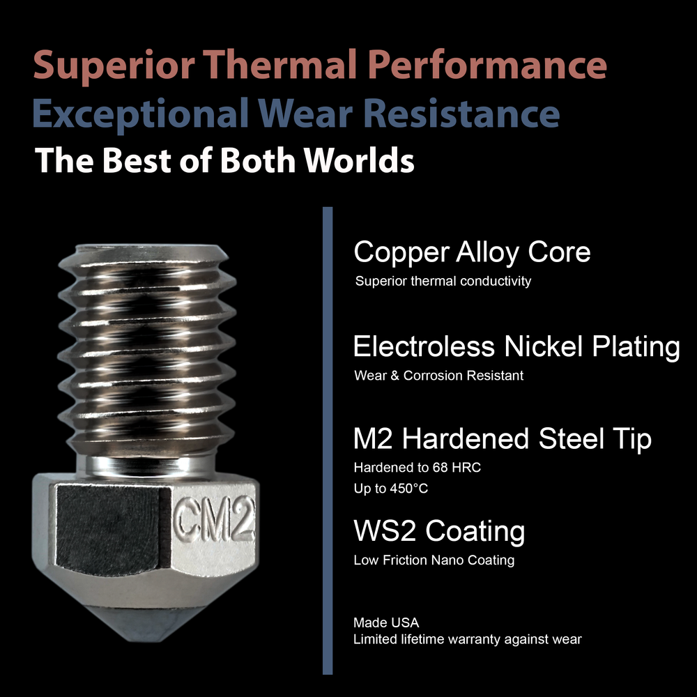 Micro Swiss CM2™ Nozzle is an ideal nozzle for all applications. Core of the nozzle is made of high-temperature Copper Chromium Zirconium and plated with an Electroless Nickel Plating. This special alloy retains its strength at much higher temperatures compared to a regular copper alloy. The tip of the nozzle is made of M2 Hardened High Speed Steel and coated with a special nonstick nano coating.