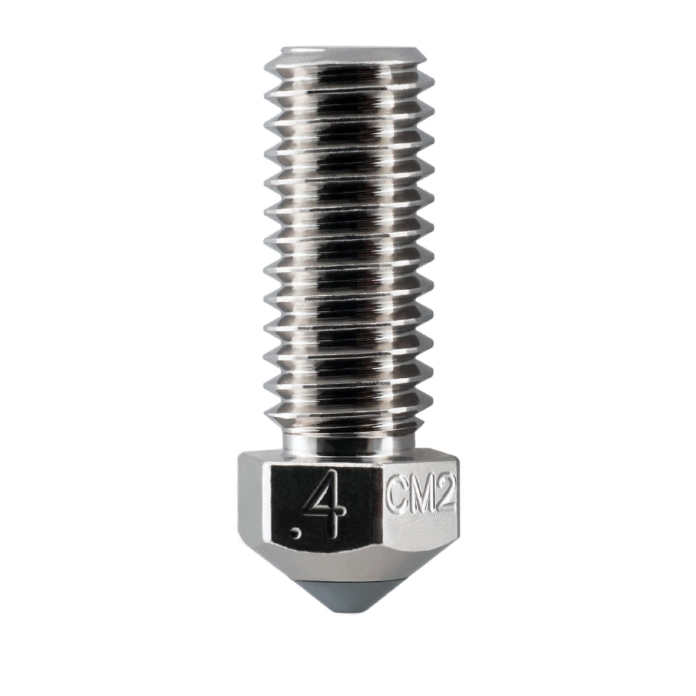 Microswiss CM2™ Nozzle is an ideal nozzle for all applications. Core of the nozzle is made of high-temperature Copper Chromium Zirconium and plated with an Electroless Nickel Plating. This special alloy retains its strength at much higher temperatures compared to a regular copper alloy. The tip of the nozzle is made of M2 Hardened High Speed Steel and coated with a special nonstick nano coating.