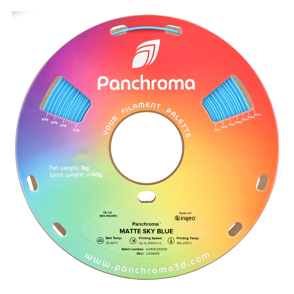 Panchroma™ Matte is a bioplastic-based 3D printing filament designed to set a new standard for PLA. It offers exceptional ease of use, reliable printing quality, fast print speeds, and consistent performance on a wide range of printers.