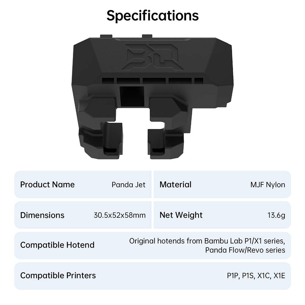 Panda Jet is an omni-directional cooling fan duct, printed with high-quality MJF nylon, featuring high-temperature resistance, high strength, corrosion resistance, and durability, ensuring long-lasting performance. The Panda Jet's innovative air path design and corner outlet placement precisely channel cooling air to the nozzle, enhancing bridging and overhangs while keeping the print view clear. It enables seamless installation to the hot ends of the Bambu Lab P1/X1 series and also works with the Panda Flow and Revo series hot ends.