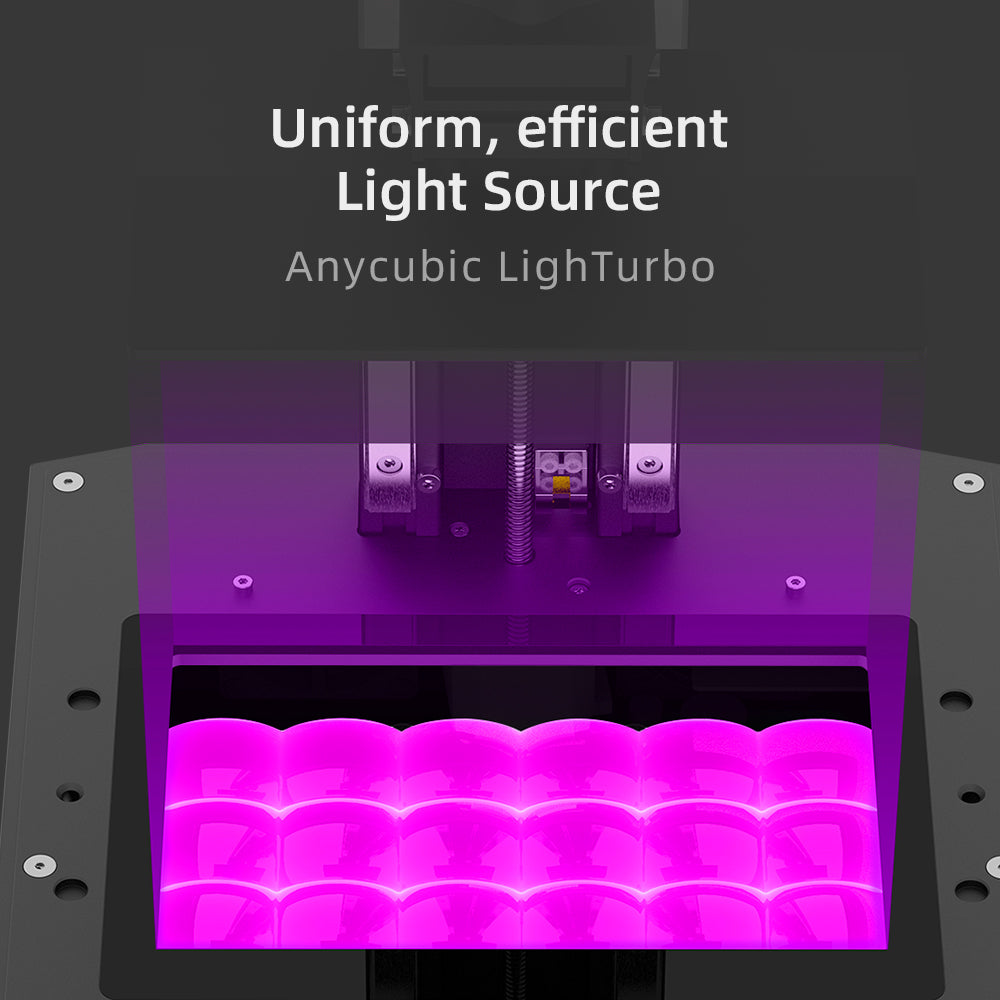 Equipped with an improved Anycubic LighTurbo matrix light source that projects UV light both parallel and perpendicular to the LCD screen, providing a more uniform light exposure that improves the quality of printed models.