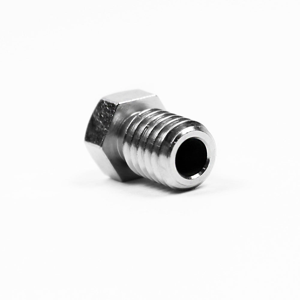 This is RepRap style nozzle, it is made from a 360 brass base material and plated with TwinClad XT coating. TwinClad XT is a nickel composite coating designed for very low friction. It offers one of the lowest coefficient of friction, better than nickel with PTFE co-deposit. This coating is also very hard and abrasion resistant. If you are working with abrasive Carbon Fiber, Stainless Steel, wood filled or any other metal filled filaments, this will greatly improve the life of your nozzle.